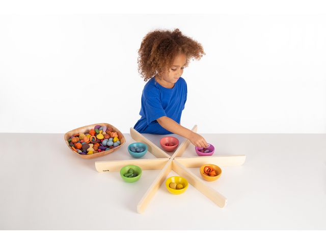 En enkel men effektiv uppsättning attraktiva skiljeväggar av björkplywood som enkelt kan sättas ihop för att bilda en cirkulär 6-vägs sorteringssirkel. Uppställningen har utformats för att passa inuti bordet i samma serie för sortering under upptäcktslek, men eftersom den är portabel och lätt att använda kan den också sättas upp oberoende på en golvyta eller bord för fri lek, sortering, räkning eller mönsterskapande. Stödjer följande inlärningsområden: Matematik - sortering Personlig utveckling - samarbetslek Fysisk utveckling - motoriska färdigheter Förståelse för världen - observation Främjande av miljön - praktiska resurser Storlek monterad: H 50mm x 646mm diameter Material: Bassplywood FSC 100%
