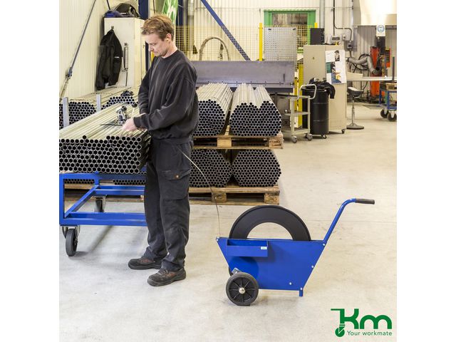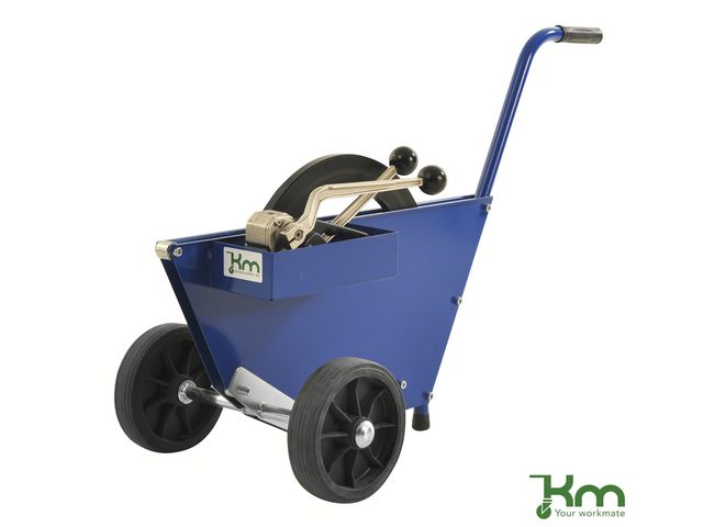 Klassisk bandvagga till stålband, 16-19mm. Med ett praktiskt fack för bandverktyg och ett rymligt fack för verktyg och tillbehör. Passar enkelspolat band från 16 -19 mm bredd. Enkel och snabb skiftning av spole. Solida gummihjul på 200mm. Pulverlackerad. Levereras omonterad. Obs! Bandningsverktyg och stålband ingår inte. Storlek: 990 x 460 x 640 mm (LxBxH) Färg: blå Vagnens vikt: 16 kg Bromsade hjul: nej Hjultyp: 2st fasta 200 mm gummihjul 25 % Post-consumer återvunnet material
