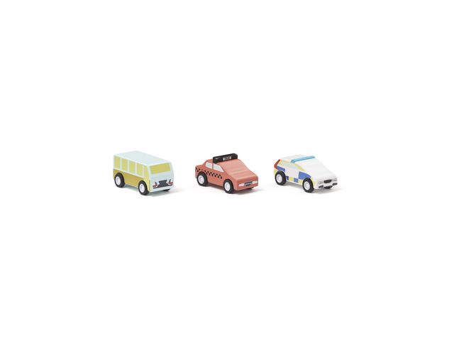 3-pack bilar i trä, en buss, en taxi och en polisbil. Dra dem bakåt och swoooosh - så åker de framåt! Varje bil har en liten mekanism inuti som gör det möjligt att bilen kan röra sig framåt av sig själv. Kommer i en pappförpackning som man kan leka garage med. Material trä och kartong Mått bil, längd 8cm Rekommenderad ålder: från 3 år FSC CE