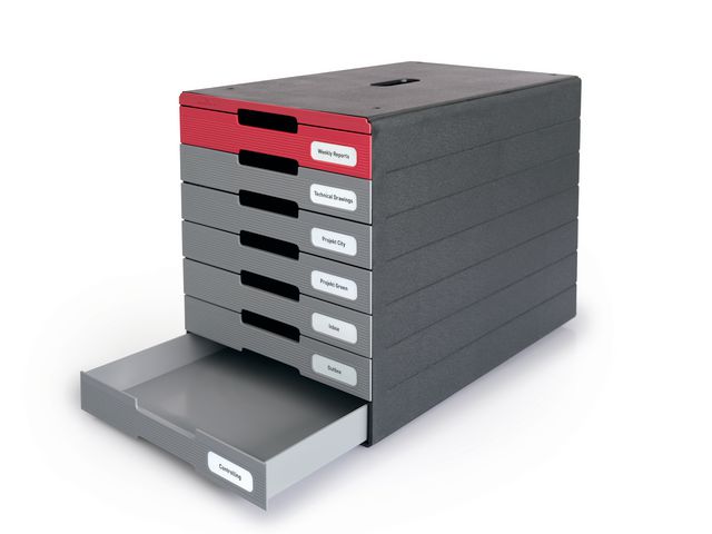 Idealbox Pro 7 grå-röd är en praktisk och smidig förvaringslåda med utdragbara lådor för förvaring, sortering, och snabb åtkomst av olika dokument. Dessa förvaringslådor med hög slittålighet passar för användning på kontor, inom produktion eller i lagermiljöer. Kan stå framme på skrivbord, bänkar och hyllor eller i kontorsskåp på t.ex. bilverkstäder, lagerterminaler, lantbruk och handelsträdgårdar. Den har 7 lådor med fronter och handtag som är enkla att greppa. Ett ark med 8 borttagbara klisteretiketter (15x50 mm) för uppmärkning av lådorna medföljer. Gratis mallar för etiketterna finns i DURAPRINT®. Certifierad med den tyska miljömärkningen Blue Angel som ställer höga miljökrav på produktdesign och är sedan 1978 en pålitlig guide för en mer hållbar konsumtion. Plasten i Idealbox består av minst 80% återvunnen plast samtidigt som den har lång livslängd och är fullt återvinningsbar. Mått: 250 x 322 x 365mm Färg: grå och röd Certifierad Blue Angel 7 lådor med innerhöjd på 3,4 cm Rymmer dokument upp till C4 storlek 8 etiketter medföljer Gratis mall för fler etiketter finns i DURAPRINT Utdragsstopp på lådorna Helt återvinningsbar Tillverkad av 80% återvunnet material