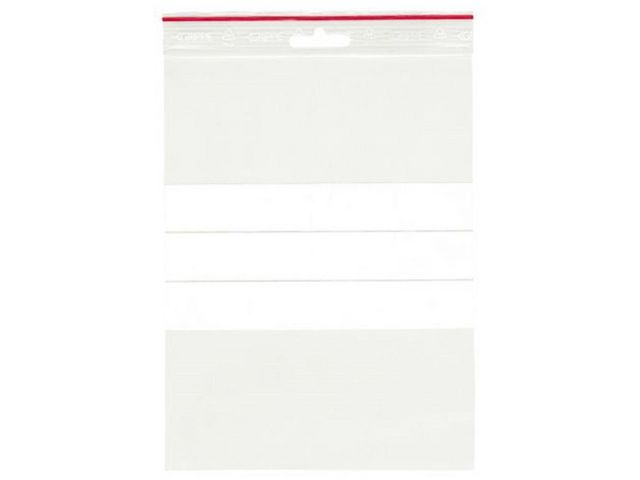 Blixtlåspåse tillverkad av LDPE med 5mm eurohål för upphängning och tre vita skrivfält. Med kraftig blixtlåsförslutning och röd linjemarkering. Livsmedelsgodkända. 100 påsar per bunt, 1000 påsar per förpackning. Storlek: 150x200mm (innermått) Modell: T-84 Tjocklek: 90 mikron Hålning: Eurohål Volym: 0,4 liter Livsmedelsgodkänd