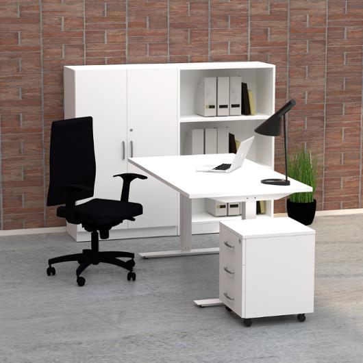 Ett komplett skrivbord med 2-motorigt höj- och sänkbart stativ Ett komplett skrivbord med 2-motorigt höj- och sänkbart stativ från svenska Rol-Ergo med 25 mm tjocka rektangulära skrivbordsskivor i laminat. Skrivbordet har steglös höjdreglering mellan 710-1180 mm, en slaglängd på 470 mm som gör det lätt för användaren att skapa en ergonomisk arbetsmiljö. Fristående T-ben ger optimal rörlighet i och med obegränsat benutrymme. Stativet är kvalitets och miljöcertifierade. Skulle behoven ändras framöver så är stativet flexibelt i sidled, detta innebär att samma stativ kan användas på skivor mellan 1000 – 1600 mm. Steglös höjdreglering mellan 710-1180 mm 2-motorer Ljudnivå < 48 dBa