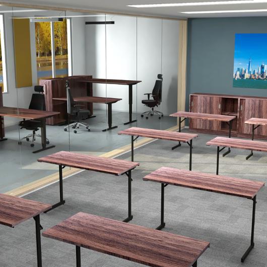 Ett komplett skrivbord med svensktillverkat höj- och sänkbart 2-motorigt stativ Ett komplett skrivbord med svensktillverkat höj- och sänkbart 2-motorigt stativ med 25 mm tjocka rektangulära skrivbordsskivor. Skrivbordet har steglös höjdreglering mellan 630-1290 mm, vilket ger en slaglängd på hela 660 mm som gör det lätt för användaren att skapa en ergonomisk arbetsmiljö. Fristående ben ger optimal rörlighet i och med obegränsat benutrymme. Skulle behoven ändras framöver så är stativet flexibelt i sidled flexibelt mellan 1150 – 1740 mm, detta innebär att samma stativ kan användas på skivor mellan 1200 – 2000 mm. Stativet är kvalitets och miljöcertifierade. Steglös höjdreglering mellan 630-1290 mm 2 motorer Ljudnivå < 42 dBa Testad enligt: EN 527-2:2016 Testad enligt: ISO 21016 CE-märkt