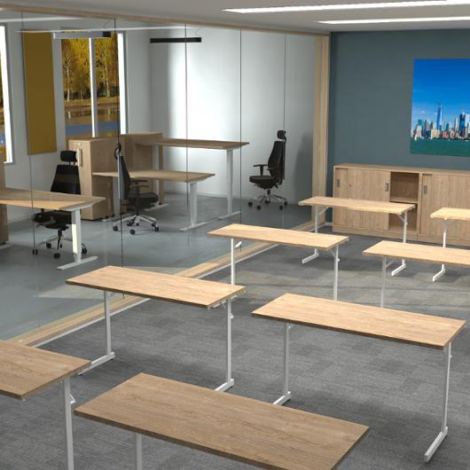 Ett komplett skrivbord med svensktillverkat höj- och sänkbart 2-motorigt stativ Ett komplett skrivbord med svensktillverkat höj- och sänkbart 2-motorigt stativ med 25 mm tjocka rektangulära skrivbordsskivor. Skrivbordet har steglös höjdreglering mellan 630-1290 mm, vilket ger en slaglängd på hela 660 mm som gör det lätt för användaren att skapa en ergonomisk arbetsmiljö. Fristående ben ger optimal rörlighet i och med obegränsat benutrymme. Skulle behoven ändras framöver så är stativet flexibelt i sidled flexibelt mellan 1150 – 1740 mm, detta innebär att samma stativ kan användas på skivor mellan 1200 – 2000 mm. Stativet är kvalitets och miljöcertifierade. Steglös höjdreglering mellan 630-1290 mm 2 motorer Ljudnivå < 42 dBa Testad enligt: EN 527-2:2016 Testad enligt: ISO 21016 CE-märkt