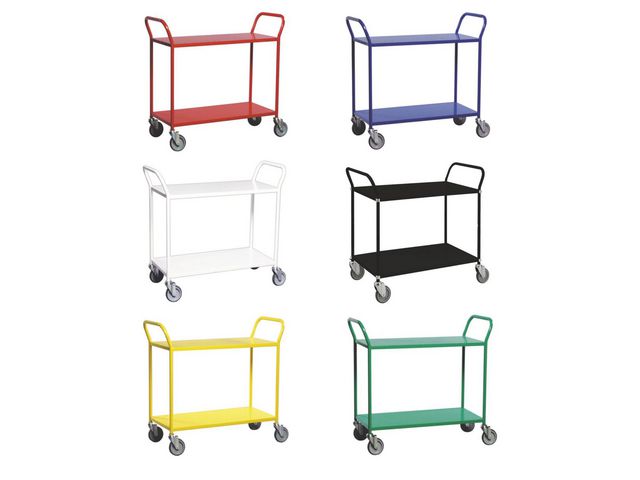 Praktisk svart plåtvagn i två plan. Hyllplanen kan monteras med kant upp eller ner efter eget önskemål. Rejäla 125mm hjul vilket gör den lätt att köra. Levereras omonterad. Belastning: 250 kg Storlek: 1080 x 480 x 940 mm Höjd till översta hyllplan: 760 mm Avstånd mellan hyllplan: 530 mm Hyllplan: 900 x 440 mm Hjul: 4 länkhjul, 125 mm Vagnens vikt: 23 kg Bromsade hjul: nej 25 % Post-consumer återvunnet material