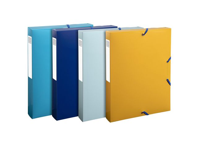 Boxmapp med 40mm rygg tillverkad av 98% återvunnen PP-plast i A4-format ur serien BeeBlue i sorterade färger. BeeBlue ger ett härligt tillskott av färg i arbetsmiljön, och är skapad med tanken att öka både organisation och entusiasm. Lämplig för alla organisatoriska behov på kontoret och hemmakontoret. Serien är skapad med Blue Angel-certifierad återvunnen PP-plast, vilket ger nytt liv åt gamla material och inkorporerar ett urval av 4 levande trendiga färger saffran, marinblå, ljusblå och turkos. Utmärkt dokumentbevaring tack vare 3 inre flikar och 2 blå elastiska band. Praktisk för transport och förvaring av dina dokument. BeeBlue-filboxen är utformad i ett format på 25x33 cm för att rymma A4-dokument men också elastiska mappar, filer och underfiler. Ryggetikett ingår för att identifiera innehållet. Tillverkad av 98% återvunnen PP-plast 3-klaffsmapp med elastiska förslutningar Storlek 25 x 33cm för A4-ark Ryggetikett för att identifiera innehållet 4 sorterade färger: saffran, turkos, marinblå och ljusblå Plastfri förpackning 97% återvinningsbar 98% återvunnet material Tillverkad i Frankrike Blue Angel