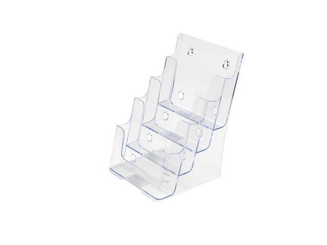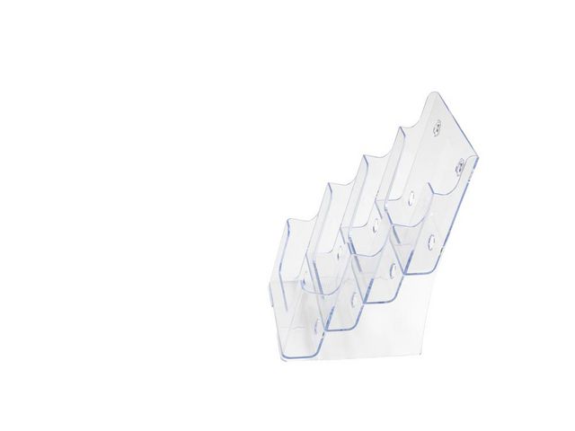 Visa enkelt upp broschyrer och material i detta väggställ med fyra fack som är designad för material i A5 format. Ett effektivt sätt att visa upp mycket material på liten yta. Här får du en tydlig överblick av broschyrer, informationsblad eller blanketter. Stället är vinklat vilket gör det enkelt att få tag i tryckmaterialet. Ställets stora kapacitet kan hålla flera hundra A5-ark. Med sin enkla och eleganta design kan stället användas kommersiellt i butiker, kontorsreceptioner för att ge kunderna mer information. eller för hemmakontoret. Tillverkad av transparent akryl och lätt att se igenom. Med över 60 års erfarenhet levererar Deflecto som inspirerar, skyddar och organiserar de saker du värdesätter så att du kan fokusera på det du är bäst på. Hög kvalitet Transparent akryl Elegant design Hög kapacitet: håller sammanlagt över 100 ark A5