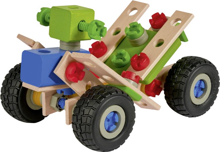 Bygg din egen äventyrsmaskin – fyra modeller i ett set! Skapa, bygg och lek med denna mångsidiga byggsats! Du kan montera en Quad, trehjuling, minibuggy eller strandbuggy enligt medföljande beskrivning – eller låt fantasin ta över och skapa egna konstruktioner. Byggsatsen är tillverkad med hög kvalitet och säkerhet i fokus, med rundade kanter för trygg lek. Antal delar: 110 Material: bokträ Tillverkad i Tyskland Rekommenderad ålder: från 4 år FSC 100 %