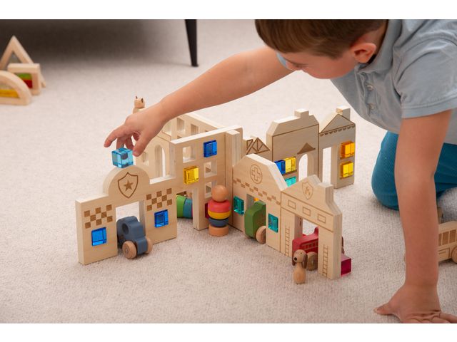 Stadsinspirerade avdelare i björkplywood, som enkelt passar ihop för att skapa en fantasifull lekplats i fyra riktningar. Graverade med taktila bilder av en matbutik, polisstation, sjukhus och hus, är avdelarna en idealisk resurs för barn att skapa små världsscener. Stödjer följande inlärningsområden: Uttrycksfull konst & Design - fantasifull lek Kommunikation & Språk - beskrivande språk Personlig utveckling - samarbetslek Förståelse av världen - utforskning 2-delars set Storlek: 595 x 595 x 170mm Material: Björkplywood Rekommenderad ålder: från 3 år FSC 100%