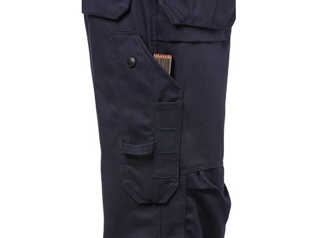 Flamskyddade hantverksbyxor med multinorm och hög bomullskomfort – säkra och slitstarka för industribruk Dessa varselbyxor är tillverkade i ett slitstarkt, flamskyddsbehandlat material som kombinerar säkerhet med bomullens komfort. Byxorna har multinormskydd för att möta flera säkerhetskrav och är godkända för industritvätt, vilket gör dem både praktiska och hållbara i krävande arbetsmiljöer. Material: 75% bomull, 24% polyester, 1% antistatisk fiber. Förstärkningar av CORDURA® 79% flamskyddad bomull, 20% polyamid, 1% antistatisk fiber. Vikt: 365 g/m2 Certifieringar: EN ISO 11612, EN 1149-5, EN 14404, EN ISO 20471, IEC 61482-2 Tvättråd: Kan maskintvättas i maxtemperatur 75°C, normalt program Oeko-Tex Standard 100: Ö 97-055 RISE, www.oeko-tex.com