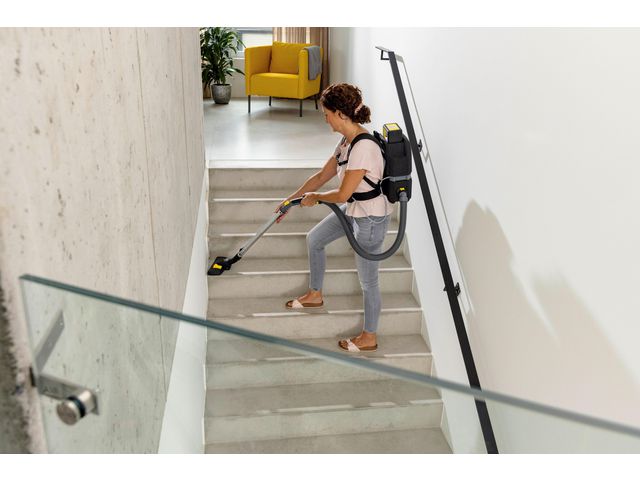 Batteridriven ryggdammsugare för smidig åtkomst i trånga utrymmen. Ultralätta, kraftfulla och batteridrivna ryggdammsugaren väger tack vare det innovativa EPP materialet under 4,6 kg (buren vikt på ryggen) och som med materialets egenskaper dessutom är extremt robust och slagtålig. Med en effekt på 500 watt, en lång batteridriftstid och en 5 liters behållare så blir ryggdammsugaren sammantaget det första valet överallt där utrymmet och miljön gör dammsugning till en utmaning med en traditionell dammsugare. Det kan vara i en biograf, på ett flygplan, i en buss eller ett tåg, på ett trångt möblerat kontor eller i trapphus. Den ergonomiska konstruktionen och ramen och den genomtänkta utformningen av maskinen med alla viktiga funktioner kontrollerade via en fjärrkontroll som fästs i midjefästet samt även det enkla handhavandet oavsett om du är höger eller vänsterhänt säkerställer bekvämt och bekymmersfritt arbete. Dammsugarturbinens utformning helt utan borstar gör den långlivad och oerhört motståndskraftig mot slitage. Tänk på att batteri samt tillhörande laddare måste beställas separat. Tillverkad av extremt lätt, innovativt EPP (expanderad polypropylen) Ultra-lättvikt: 4,5kg buren vikt på ryggen 36 V Batteriplattform HEPA 14 filter som tillbehör Borstlös EC-motor Batteri ingår ej