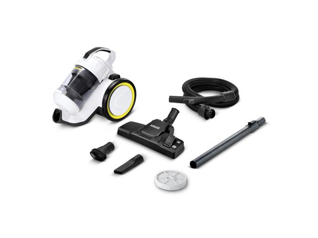 Kompakt påslös dammsugare - inga filterpåsar behövs. Med den kompakta och påslösa dammsugaren VC 3 med multi-cyklonteknik kan du dammsuga utan filterpåse. Detta besparar dig att behöva byta och köpa nya dyra filterpåsar. Du behöver bara kasta ett öga på den transparenta sopbehållaren för att se om den behöver tömmas. Dessutom ger det påslösa systemet inte heller upphov till dålig lukt, vilket uppskattas av fler än bara allergiker. Tack vare sin kompakta storlek lämpar sig VC 3 perfekt för många olika användningsområden i lägenheter och mindre hus. Fogmunstycket och möbelborsten gör det möjligt att rengöra grundligt såväl smala springor och ömtåliga ytor som hårda golv och mattor. Ett par andra utrustningsfunktioner på dammsugaren är HEPA-hygienfiltret, som på ett pålitligt sätt filtrerar de minsta smutspartiklarna som pollen och andra allergiframkallande partiklar, och den praktiska parkeringspositionen. Avtagbar sopbehållare Ingen filterpåse behövs HEPA 13 Filter Vikt utan tillbehör: 4,4kg Sugrör: 1,5m/med böjt handtag