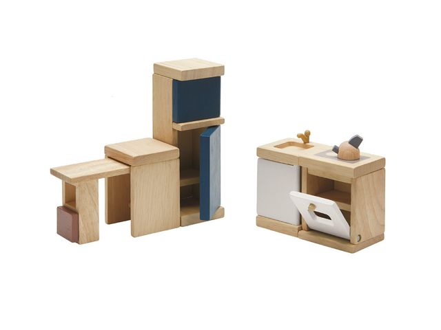 Köksinredning till dockhus. Inred dockhuset med härliga trämöbler. 6 delar: spis, skåp diskbänk, kyl/frys och kanna Material: trä Rekommenderad ålder: från 3 år