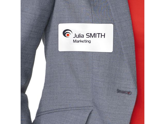 Averys självhäftande namnskyltar på rulle för etikettskrivare Har du en DYMO Writer och behöver skriva ut några namnskyltar? Som konferenssamordnare kan du i förväg framställa eleganta och informativa namnskyltar till deltagarna med hjälp av Averys självhäftande namnskyltar på rulle för etikettskrivare. Det underlättar inledningen när deltagarna möts och ger snabb överblick under mötet, seminariet eller konferensen. Det bidrar också till att skapa ett professionellt intryck och en bra stämning ? för vem har väl inte varit på konferenser där all energi under pauserna har gått åt till att försöka lista ut vem det är man står och samtalar med? Med de självhäftande namnskyltarna är det enkelt att tydligt skriva ut namn och annan information så att du kan koncentrera dig på samtalet. Averys AS0722560 på rulle för etikettskrivare motsvarar DYMO® S0722560 och är 100 % kompatibla med DYMO® Writer ? LW310, LW330T, LW400 Serie, LW450 Series, 4XL och LW Wireless! Med denna förpackning får du Averys kända kvalitetsetiketter till ett mycket attraktivt pris. Förpackningen innehåller 1 rulle med 200 etiketter. Varje etikett är 41 x 89 mm, vilket gör dem lämpliga för den vanligaste informationen som namn, företag och logotyp. Namnetiketten är tillverkad i ett flexibelt material som anpassar sig efter kläderna. Etiketterna fäster på alla textilier utom ömtåliga tyger som siden, sammet, osv. De kan naturligtvis tas av igen utan att lämna några märken på kläderna. Etiketterna designas enkelt och lätt med programvaran till din Dymo®. Eftersom Averys etikettstorlek stämmer med etiketterna från Dymo® kan du använda redan sparade designer och skriva ut dem på en Avery-etikett utan att behöva ändra något. Viktigt: Undvik permanent kontakt med tvättmedel. Då din etikettskrivare har en värme (Thermal) utskriftsmetod är etiketten inte UV-beständig. Undvik permanent exponering för direkt solljus, eftersom detta kommer att missfärga etiketten. - Antal: 200/fp