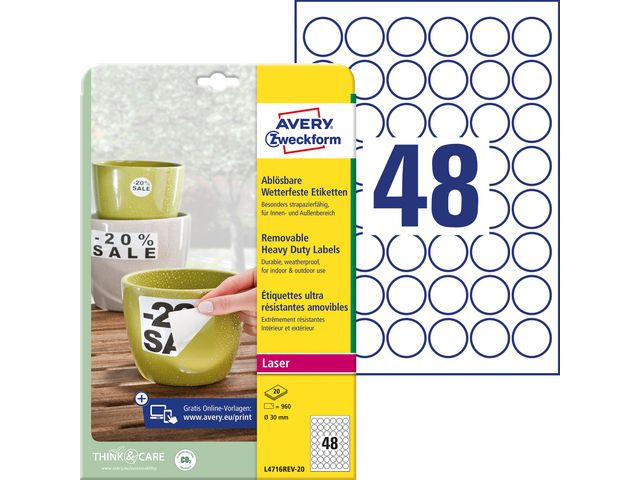 Den höga papperskvaliteten ger vackra och skarpa utskrifter. Averys avtagbara, slitstarka etiketter passar bra när du tillfälligt behöver hållbar märkning av olika föremål. Eller för skyltning utomhus där informationen bara gäller under en kortare tid och etiketten därefter enkelt ska kunna tas bort utan att använda lösningsmedel. Avery avtagbara, slitstarka etiketter uppfyller båda kraven. Etiketterna är tillverkade i ett slitstarkt och hållbart polyestermaterial som inte kan rivas sönder. Etiketterna klarar olja, smuts, vatten, fukt, UV-strålning och temperaturer från -20 °C till +80 °C, vilket gör etiketterna perfekta för utomhusbruk i alla väder och inomhusbruk i miljöer som kräver hög hållbarhet. Dessutom är etiketterna tillverkade med ett klister som gör etiketten avtagbar utan att det lämnar märken av limrester eller märken efter etiketten. Användningsområdena är oändliga, passar bland annat perfekt för handelsträdgårdar och plantskolor med mera, för prisskyltning, blomsterbehållare och andra utomhusskyltar. För lagerändamål som märkning av hyllkanter, lådor, boxar osv. Marknadsföringsmaterial för utomhusskyltning som ändras regelbundet mm. Avery L4716REV-20 avtagbara, slitstarka etiketter med 48 runda etiketter/ark och 960 runda etiketter/pkt med etikettmått Ø 30 mm. Etiketternas storlek är avsedd för mindre föremål. Etiketterna kan skrivas ut med alla laserskrivare och färglaserskrivare. Den höga papperskvaliteten ger vackra och skarpa utskrifter. Averys JamFREE?-garanti säkerställer dessutom att du inte behöver bekymra dig för om etiketterna fastnar i skrivaren och orsakar stopp. Du kan enkelt - och helt gratis - designa och skriva ut dina Avery-produkter med vår mjukvara Avery Design & Print, som innehåller mallar, grafik och designmöjligheter. Läs mer om mjukvaran här: www.avery.se/programvara - Antal: 960/fp