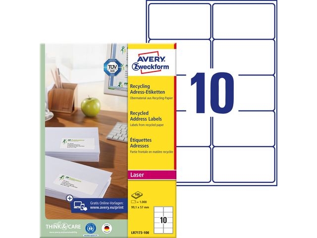 Etiketterna har en pålitlig och permanent vidhäftning Vill du ha ett ?grönare? kontor? Använder du redan miljövänliga produkter? Om din arbetsplats vill göra vad den kan för att skona miljön, använd Avery LR7173-100 etiketter med QuickPEEL av återvunnet papper med 10 etiketter/ark och 1 000 etiketter/förpackning. De är tillverkade av återvunnet papper, har ett vattenbaserat och miljövänligt lim samt är förpackade i återvunnen kartong. Och det slutar inte där! Produktionen av dessa etiketter är utformad för att undvika onödig avskogning samt förbruka mindre energi och vatten. Och förutom ett grönt samvete får du också snygga och knivskarpa utskrifter oavsett vilken typ av skrivare du använder. Averys JamFREE?-garanti säkerställer att du inte behöver bekymra dig för om etiketterna fastnar i skrivaren och orsakar stopp. Etiketterna har en pålitlig och permanent vidhäftning. Du kan enkelt - och helt gratis - designa och skriva ut dina Avery-produkter med vår mjukvara Avery Design & Print, som innehåller mallar, grafik och designmöjligheter. Läs mer om mjukvaran här: www.avery.se/programvara - Antal: 1000/fp