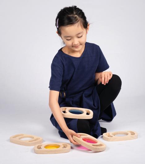 Upptäck färger på ett helt nytt sätt! Sensoriska färgpaneler som låter barn utforska världen genom färg och ljus. Varje panel är tillverkad i akrylglas och ger en spännande visuell upplevelse när man tittar på föremål genom olika färger. Kombinera två paneler för att skapa nya färgtoner och stimulera kreativitet och nyfikenhet. Antal: 3 paneler per förpackning Färger: Blå, rosa, gul Mått: 18,5 × 12 × 2 cm Material: Akryl och gummiträ Rekommenderad ålder: från 3 år FSC 100%