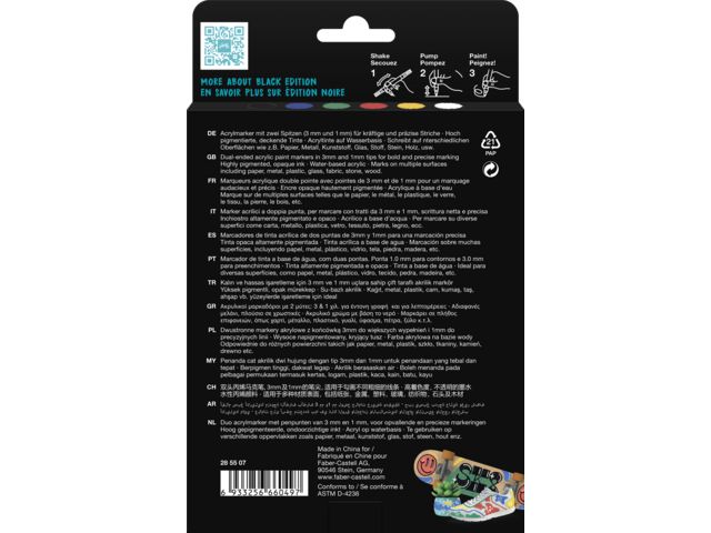 Högpigmenterat, täckande vattenbaserat akrylbläck. Shake & pump-funktion för ultimat flödeskontroll, Bekvämt markörformat med dubbla ändar i 3 mm och 1 mm kulspetsar, för ökad mångsidighet. Fungerar på de flesta ytor inklusive papper, metall, plast, glas, tyg, sten och trä. Vattentålig finish. Antal: 6/fp Metallic