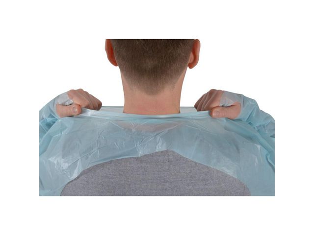 Engångsförkläde av plast med långa ärmar och tumöglor, nackband och knytband i ryggen. Används för att skydda användaren där en hög hygienstandard krävs, t.ex. i sjukvårdssektorn, i livsmedelsindustrin eller i produktions- eller produktförpackningslinjer. Förklädena är förpackade styckvis och i en kartong. Produkten är CE-märkt. Mått: 112 x 1250 mm Färg: blå Antal: 20/fp Livsmedelsgodkänd CE-märkt