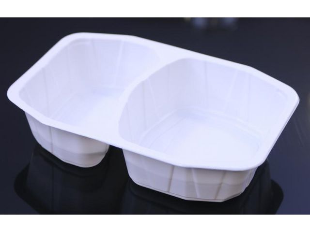 Perfekt för take-away! Portionsform TechPack HMR, 2-fack i vit mineralfylld PP, passar för varm och kyld mat. Mått: 215x148x50 mm Volym: 600+400 ml Går att frysa
