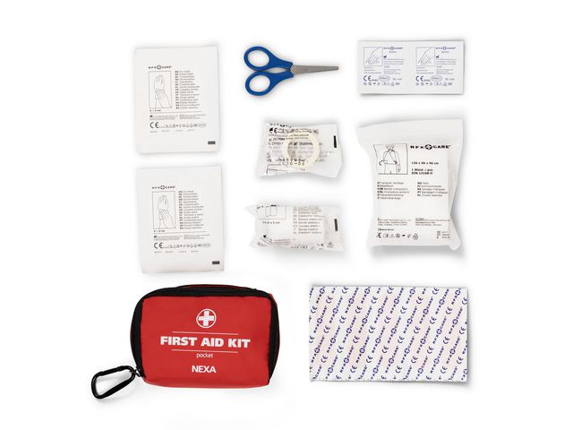 Första hjälpen väska i ett praktiskt format att alltid bära med sig. Med 13 nödvändiga delar och utrymme för egen komplettering kan du snabbt och enkelt hantera småsår. Medföljande karbinhake kan avnändas på både barnvagn eller ryggsäck. Innehåller: Plåster Hudrengöringsservett Torkservetter Elastiskt bandage Trekantsbandage Självhäftande tejp Sax Innehåller 13 delar Mått: 95 x 130 x 55 mm