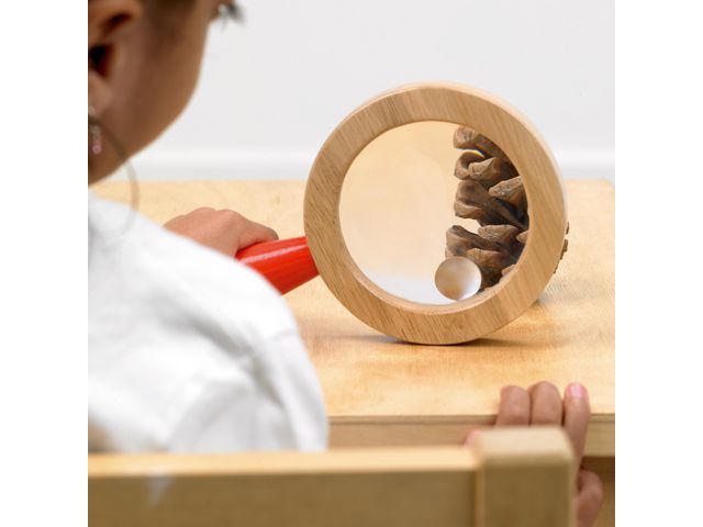 Ett utmärkt hjälpmedel för observation. Plastlins med 2x förstoring samt insatt lins med 3x förstoring. Stödjer följande lärandeområden: Förståelse av världen - observation Förståelse av världen - utforskning Mått: 100 mm Rekommenderad ålder: från 12 månader Material: Akryl, gummiträ FSC 100%