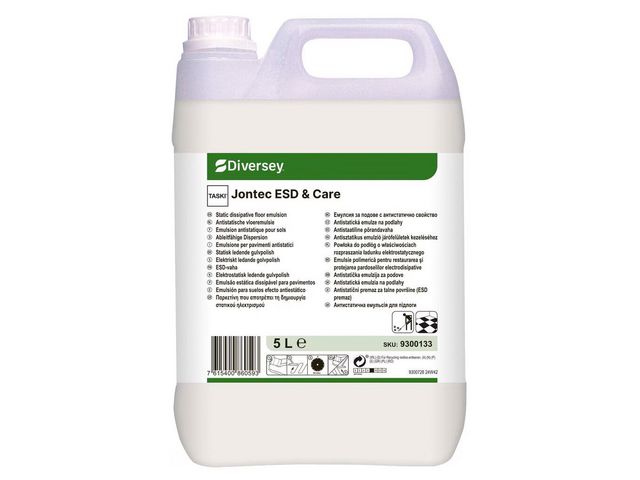 Bildar ett skyddande, högblankt skikt – för ESD-säkra golv och känslig elektronik. Jontec ESD & Care - denna elektriskt ledande golvpolish är speciellt framtagen för att förhindra uppbyggnad av elektrostatiska fält på golv och skador på känslig elektronisk utrustning. Den bygger upp en skyddsfilm med hög glans som fungerar med de flesta underhållsmetoder. Produkten är idealisk för utrymmen där elektrostatiska urladdningar kan ge skador på elektronisk utrustning och för ESD-godkända golv där de elektriskt ledande egenskaperna måste upprätthållas, samt för att underlätta rengöring och bevara ett fräscht utseende. Ger en garanterat säker ESD-funktion för ytägare, patienter, etc. Klar att använda, ingen utspädning krävs. Behandla endast strippade, noggrant sköljda och helt torra golv. pH-värde: 9 Lukt: produktspecifik Utseende: mjölkig vit vätska