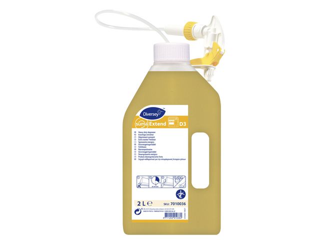 Bruksfärdig effektiv fettlösare för rengöring av fett, fastbränd mat och olja från köksutrustning såsom ugnar, grillar, spiskåpor, kokgrytor och insidan på diskmaskiner. Ett flytande alkaliskt rengöringsmedel för manuell rengöring av svårt nedsmutsade ytor i storkök. Produkten är utmärkt för rengöring av alla typer av fett och fastbränd mat. Produktens sammansättning är uppbyggd för att skydda ytor av aluminium. Suma Extend D3 används i koncentrat med ett effektivt skumspraymunstycke. Säker på aluminium pH-värde: 12,5 Utseende: Klar gul vätska