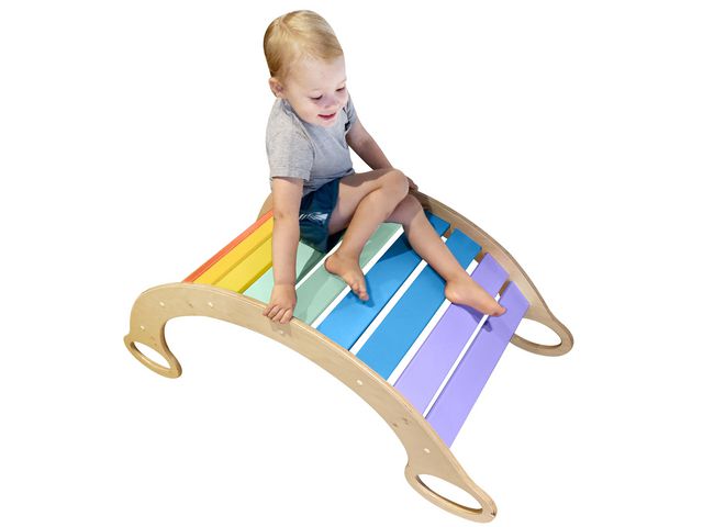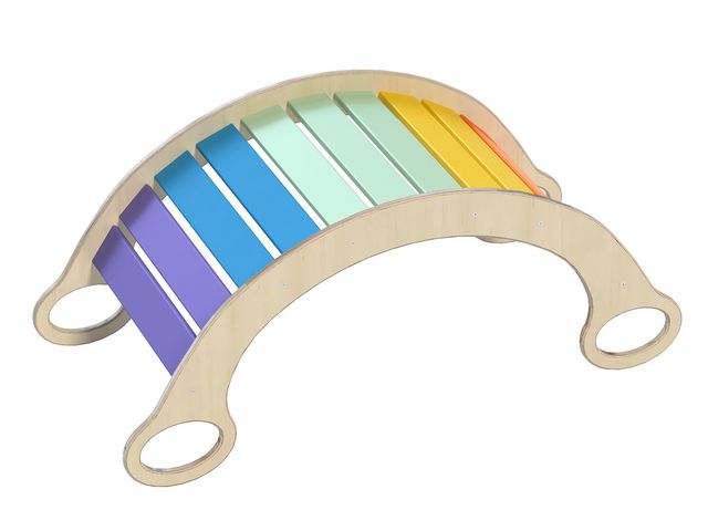 Upptäck glädjen med att balansera och gunga med denna trägunga och tunnel! Denna trägunga i härliga färger fungerar som både en gunga och en tunnel. Den låter dig arbeta med din balans såväl som din ögon-hand-koordination genom att krypa under eller klättra över den. Denna tunnel är idealisk för att stärka ben- och ryggmuskler och förbättra hållning. Gungan är enkel att montera och tar inte mycket plats. De fyra handtagen underlättar rörelsen och säkerställer säkerhet när man gungar. Material: plywood, lackad och målad med vattenbaserad färg Levereras omonterad FSC 100%