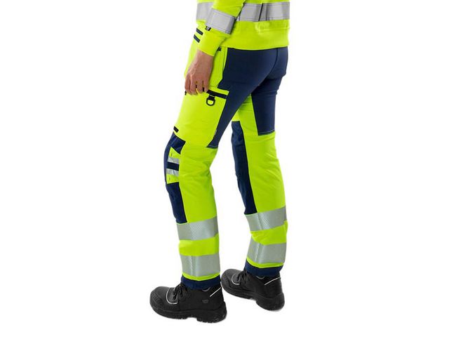 För hantverkare, montörer och installatörer. Miljödeklarerade varselbyxor med stretch, anpassade för kvinnor Dessa certifierade varselbyxor i dammodell kombinerar funktionalitet med ett hållbarhetsfokus. Plagget är utvecklat med en flexibel 4-vägsstretch och förstärkta partier för ökad rörelsefrihet och slitstyrka i krävande arbetsmiljöer. Midjan har stretchpaneler som ger följsam passform hela dagen. Tillverkade i delvis biobaserat och återvunnet material och miljödeklarerade enligt EPD. Material: Stretchmaterial 44% PTT (delvis biobaserat material), 44% polyester, 12% återvunnen polyester. Ripstop stretchmaterial 87% polyamid, 13% elastan. Vikt: 260 g/m2 Certifieringar: EN 14404 med knäskydd 161608, EN 20471, EN 13758-2, RIS-3279-TOM Tvättråd: Kan maskintvättas i maxtemperatur 60°C Oeko-Tex Standard 100: Ö 97-055 RISE, www.oeko-tex.com