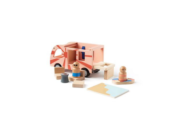 Husbil i FSC-certifierat trä. Bilen har massor av olika funktioner och finesser. Solpanelen på taket kan förvandlas till en strand om du vänder på den. Fäll ner bakdörren och använd den som en solterrass som du kan sitta på ända till solnedgången. Stolar, ett bord, en grill och surfbräda ingår. Figurerna Joel och Saga är riktiga globetrotters. De lever sitt bästa liv och har renoverat och byggt om en gammal pickup, fixat ny interiör och målat utsidan i glada, soliga färger. Saga har byggt ett fäste för sin surfbräda på sidan av bilen och surfar så snart hon får tillfälle. De har skapat sig en oas med sin van - som de kan ta med sig överallt. Ett av deras motton i livet är, `vänd ditt ansikte mot solen, och du kommer aldrig se skuggan`. Uppmuntrar till roll spel och stimulerar fantasin där allt är möjligt. Material: trä FSC-certifierad Rekommenderad ålder: från 2 år CE