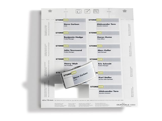 Insticksetiketter på A4-ark för utskrift i laser- eller inkjet skrivare. Lätt att dela etiketterna med microperforering. Programvara finns att ladda ner som hjälper dig att skriva ut personligt designade etiketter på www.durable.se. Insticksetikett 75x40mm (BxH). 150 grams papper. 12 etiketter per ark, 20 ark per förpackning.