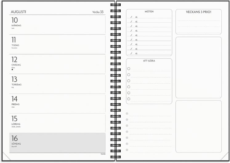 OBS! Almanackor för läsår 2026/2027 preliminär leverans fr.o.m. vecka 10! Få det Gjort är en smakfull kalender med bra möjlighet att komplettera dina redan existerande tekniska lösningar. En kombination av analog och digital planering är ett vinnande koncept för din vardags- och jobbplanering! A5 kalendern har veckouppslag med hela veckan i en horisontell layout på vänster sida och till höger finner du olika listor för inköp, prioriteringar och möten. Lägg till ett stilfullt omslag eller uppskatta den stilrena svart/vita designen precis som den är. Format: A5 Mått: 220 x 160 x 15 mm Layout: Vecka/uppslag, liggande Kalendarium: 2026-06-08 - 2027-06-27 Omslag: Kartong med struktur, spiralbunden Detaljer: Gummiband, pappersficka Innehåll: Flaggdagar, helgdagar/aftnar, månfaser, namnsdagar, internationella helgdagar översikt, temadagar/händelser, års plan/årsplaner, anteckningssidor linjerade Antal sidor: 144 FSC Mix
