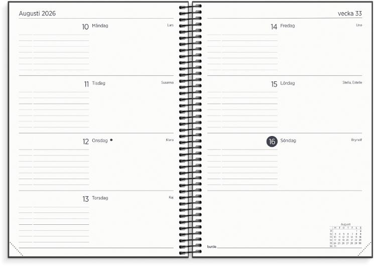 OBS! Almanackor för läsår 2026/2027 preliminär leverans fr.o.m. vecka 10! En kalender och anteckningsbok i ett! Första halvan innehåller ett kalendarium med vertikal veckolayout, medan andra halvan är linjerade sidor för dina listor och anteckningar. Med hjälp av de flyttbara flikarna förflyttar du dig smidigt mellan veckoplanering och anteckningar. Perfekt som komplement till digital planering. Klädd i en svart strukturerad kartong blir Organizer & Notes en stilful l följeslagare på möten och i vardagslivet. Format: A5 Mått: 217 x 170 x 24 mm Layout: Vecka/uppslag, liggande Kalendarium: 2026 -06-01 - 2027-07-11 Omslag: Kartong med struktur, spiralbunden Detaljer: Gummiband, flyttbara plastmarkörer Innehåll: Flaggdagar, helgdagar/aftnar, månfaser, namnsdagar, temadagar/händelser, årsöversikt/årsöversikter, årsplan/årsplaner, anteckningssidor Antal sidor: 256 FSC Mix