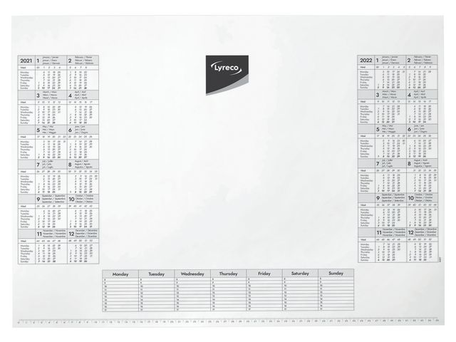 Kalenderrefill till skrivunderlägg, Lyreco. Kalenderrefill med 25 ark med tryckta veckodagar och månader (på engelska) till skrivunderlägg från Lyreco. Inkluderar åren 2024 och 2025. En refillkalender för skrivunderlägg 25 ark med tryckta veckodagar och månader Sträcker sig över en tvåårsperiod