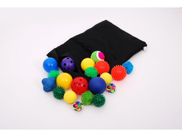 Ett urval av 20 bollar med olika texturer, färger, densitet och studs egenskaper. Utvalada av specialister för förskole- och förskoleåldern. Bollarna levereras i en svart påse. Stödjer följande inlärningsområden: Personlig utveckling - sensorisk Fysisk utveckling - motorik Förståelse av världen - färg Kommunikation & Språk - beskrivande språk Största bollens diameter: 75 mm Minsta bollens diameter: 50 mm Paket om 20 bollar Material: Påse - Polyester, Gröna & Orange bollar - PVC, Pompom bollar - Polyester, Alla andra bollar: PU