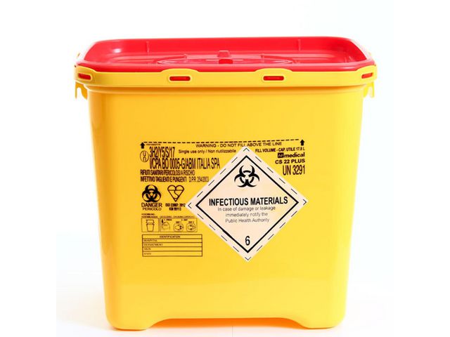 Kanylburk med volym på 22 liter, i serien Plus med dubbellock för försegling. UN-godkänd och uppfyller kraven enligt British Standard/NFX avseende punktionssäkerhet. Volym: 22 liter Färg: gul
