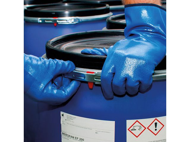 Varmfodrade nitrilhandskar lämpliga för vått arbete och kemikaliehantering, inom fiskeindustri, övrig livsmedelsindustri, tillverkningsindustri, jordbruk, oljeindustri, sanering och underhåll i kalla miljöer. Med god anatomisk passform för största möjliga komfort. Högt nötningsmotstånd ger slitstarka handskar. Godkända för användning i direkt kontakt med alla typer av livsmedel, inklusive livsmedel med hög fetthalt (EN 1186). Passar medeltungt till tungt arbete. Produkten är CE-märkt. Godkända enligt: EN 388:2016+A1:2018, EN 374-1:2016 Type B, EN 374-5:2016 Skyddskategori: III Tjocklek: Fleece + 0,8mm Livsmedelsgodkända Vattentät CE-märkt