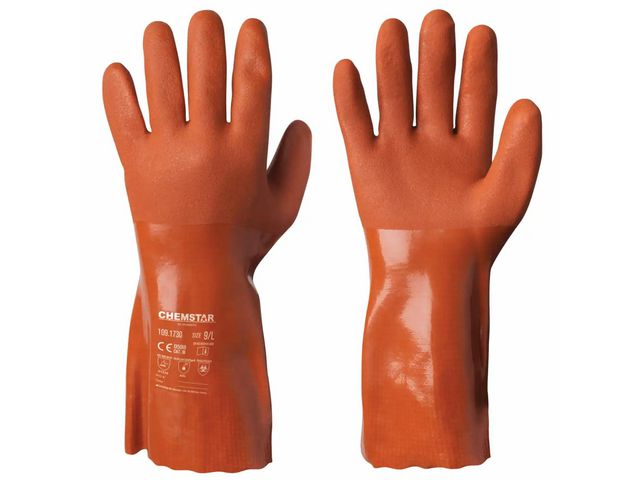 Lämpliga för medeltungt till tungt, vått arbete och kemikaliehantering (enligt test), inom fiskeindustri, tillverkningsindustri, jordbruk, sanering och underhåll. Kemikalieresistenta handskar, Chemstar, i vinyl med interlockfoder i bomull. Smidiga och mjuka med foder utan sömmar för hög komfort. Sanitized®-behandlade för att förhindra bakterietillväxt och ge en fräsch känsla. Produkten är CE-märkt. Godkänd enligt: EN ISO 21420:2020 + EN 388:2016+A1:2018 + EN ISO 374-1:2016+2018/Type B + CE -märkt Skyddsklass: III AQL 0,65 Material: vinyl/PVC Foder: interlockstickad bomull Färg: orange Grepp: torrgrepp, våtgrepp, oljegrepp Längd: 30 cm Livsmedelsgodkänd CE-märkt Storlek: 11 Innehåller PVC