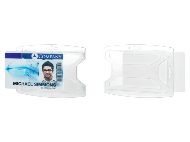 Materialbesparande och tidlös design För 1 kort. Täckt framsida som skyddar kortet. Tillverkad av 70% post-consumer återvunnet material. Materialbesparande och tidlös design Med tumgrepp på sidan så att kortet enkelt kan tas ur Kan användas med klämma, jojo, kedja eller textilhalsband/nyckelband Korthållaren kan användas antingen i stående eller liggande format Innermått: 54 x 85 mm (H x B) Tillverkad av 70% post-consumer återvunnet material