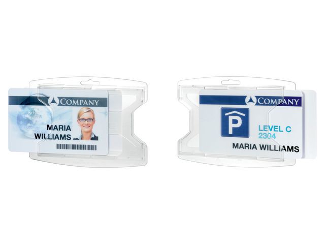 Materialbesparande och tidlös design Passerkorthållare tillverkad av 70% post-consumer återvunnen polypropylen. För 2 kort. Täckt framsida som skyddar kortet. 70% post-consumer återvunnen polypropylen Materialbesparande och tidlös design Med tumgrepp på sidan så att kortet enkelt kan tas ur Kan användas med klämma, jojo, kedja eller textilhalsband/nyckelband Korthållaren kan användas antingen i stående eller liggande format Innermått: 54 x 85 mm (H x B)