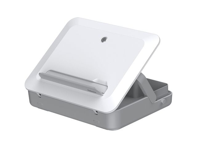 En 2 i 1 väska med laptopstativ. 100 % återvinningsbar. 2 i 1-design som inkluderar ett förvarings-/bärväska och laptopstativ i ett. 5 höjdjusteringar för ergonomisk visningskomfort för bärbar dator. Bärbar design som är lätt att ställa in, justera och förvara – perfekt för hybridarbete. Inkluderar ett inbyggt handtag och valfri bärrem. Modern och enkel designestetik tillgänglig i svart och vitt färgalternativ. Tillverkad av material som är 100 % återvinningsbara och tillverkade för att hålla med utökad 5-års begränsad garanti Mått: 38,7 x 8,7 x 29,8 cm Vikt: 1,7 kg