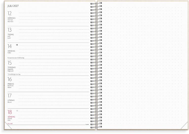 OBS! Almanackor för läsår 2026/2027 preliminär leverans fr.o.m. vecka 10! Effektivisera din vardag som lärare med hjälp av en lärarkalender, som ett analogt komplement till din digitala planering. Kalendern ger dig möjlighet att se över utmaningar och framgångar i din vardag som lärare. Här finns plats för allt ifrån scheman och klasslistor till betygstabeller. Format: A5 Mått: 215 x 175 x 25 mm Layout: Vecka/uppslag, liggande Kalendarium: 2026-06-08 - 2027-08- 22 Omslag: Återvunnen kartong, spiralbunden Detaljer: Gummiband, flyttbar plastlinjal, pappersficka Innehåll: Kyrkliga helgdagar, flaggdagar, helgdagar/aftnar, månfaser, namnsdagar, temadagar/händelser, årsplan/årsplaner, kontaktlista, utvikbar namnlista, anteckningssidor, schema, elevfrånvaro, elevförteckning Antal sidor: 256 Omslag i återvunnen kartong FSC Mix
