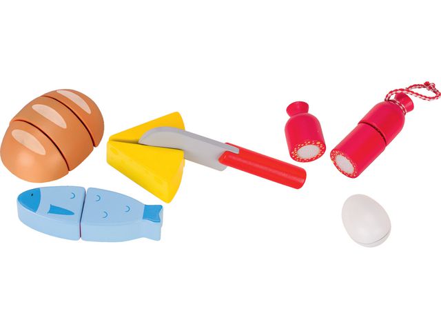Barn älskar att hjälpa till att laga mat, men att hantera en kniv säkert är en färdighet som måste läras först. Vårt set med delikatesser sammanfogade med kardborrepunkter ger ett säkert och roligt sätt att öva på att skära. Antal delar: 5 delbara matvaror 1 kniv Mått: fisk 11cm Material: trä PVC-fritt Rekommenderad ålder: från 3 år