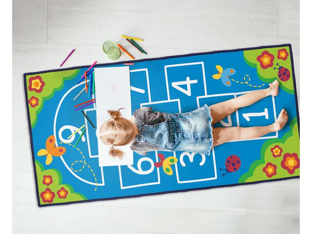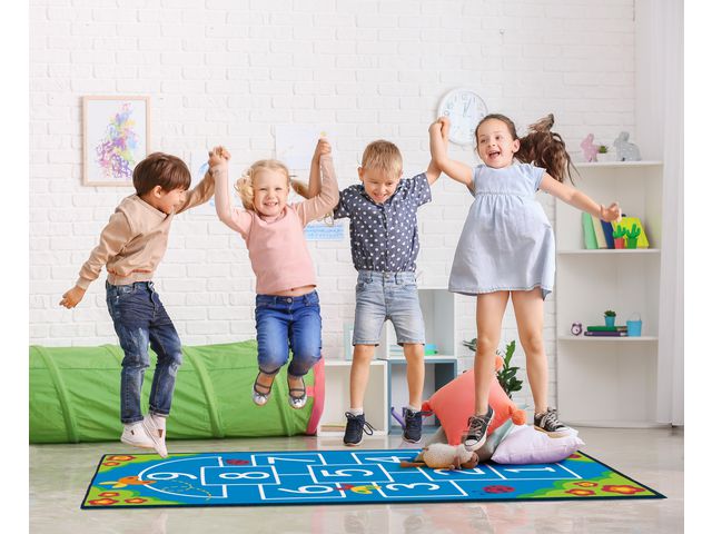 Stor Lekmatta för rolig aktivitet. Med gummerad undersida för att ligga stadigt på golvet. Mattan Hoppa Hage hjälper barnet att utveckla sin motorik och rörlighet. Mått: 100 x 200 cm Material: 100% polyester PVC-fri. Från 2år
