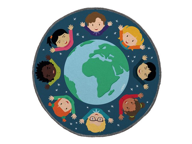 Samlingsmattan Världens barn uppmuntrar till diskussion om etnicitet och kultur. Gummerad halkfri undersida samt ovansida i härliga färger. Mått: ø 200cm Material: 100% polyester PVC-fri