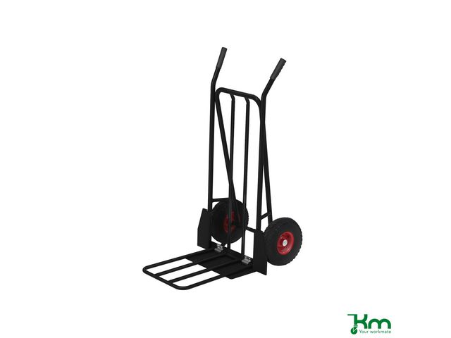 Klassisk robust kärra med fällbart lastplan. Med rejäla luftgummihjul som gör den flexibel i sina användningsområden. Belastning 250 kg Storlek: 780 x 555 x 1110 mm Färg: svart Vikt: 13 kg Bromsade hjul: nej Hjul: 260 mm luftgummihjul 25 % Post-consumer återvunnet material