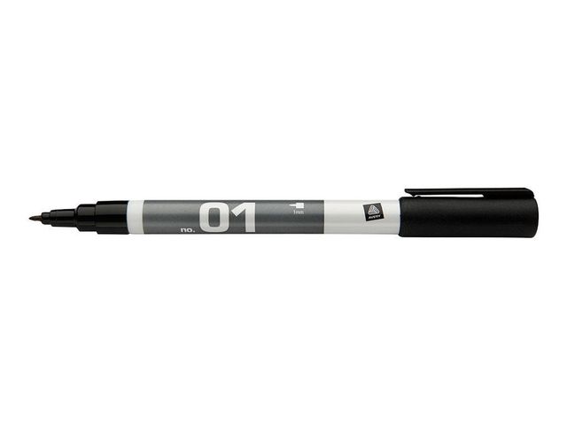 Vattenäkta och snabbtorkande alkoholbaserat bläck med hög pigmentering. Märkpenna som passar till permanent skrift och märkning av metall, glas, papp, trä, sten, plast och textilier mm. Bläcket är vattenfast och tål tvätt av textilier. Utan tulol, xylen och tungmetaller. Bläck och plastdelarna uppfyller EN71-3. Ventilerad hatt i enlighet med ISO 11540. Permanent bläck Med huv Rund spets Linjebredd: 1 mm Textfärg: Svart