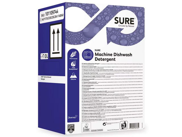 Koncentrerat flytande diskmedel för maskindisk, Cradle to Cradle-märkt. Koncentrerat flytande diskmedel för maskindisk. Effektivt för att avlägsna smuts i hårt vatten. SURE Maskindiskmedel ingår i ett unikt sortiment av växtbaserade, 100% biologiskt nedbrytbara professionella rengöringsprodukter för alla dagliga rengöringsbehov. Framställts av biprodukter från livsmedelsindustrin, t.ex. sockerbetor, majs, halmkli, vetekli och kokosnöt.. pH-värde: 11,5 Lukt: produktspecifik Utseende: färglös till gul vätska Cradle to Cradle EU Ecolabel: licensnummer SE/038/001