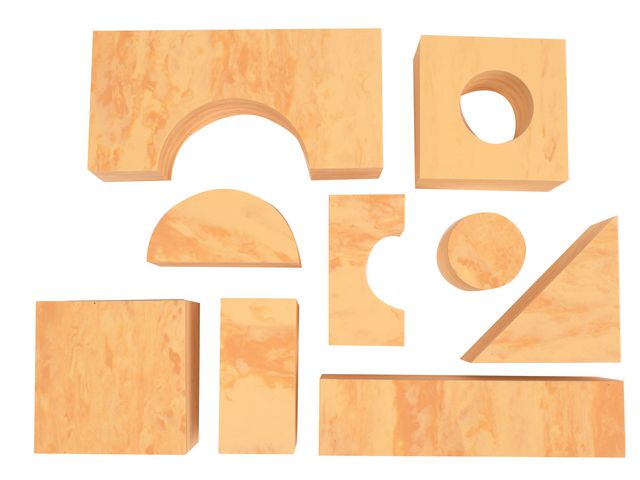 Ett set med mjuka träliknande klossar i olika former, vilket ger utrymme för kreativitet och fantasifullt byggande. De främjar inlärning inom rumsuppfattning och konstruktion. Här går lek och lärande hand i hand. Aktiviteten kan utföras ensam eller i samarbete med andra. Basmått: 4 cm (8-16 cm) Material: EVA Antal: 56 delar Passar i 1 st förvaringspåse PVC-fritt Rekommenderad ålder: från 3 år CE